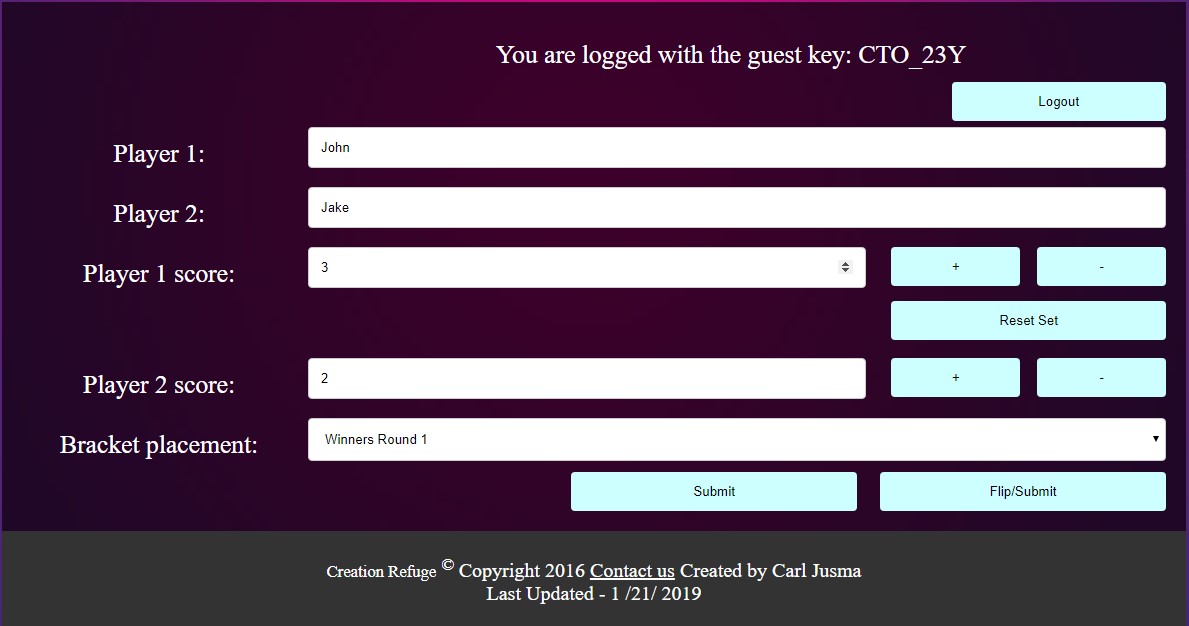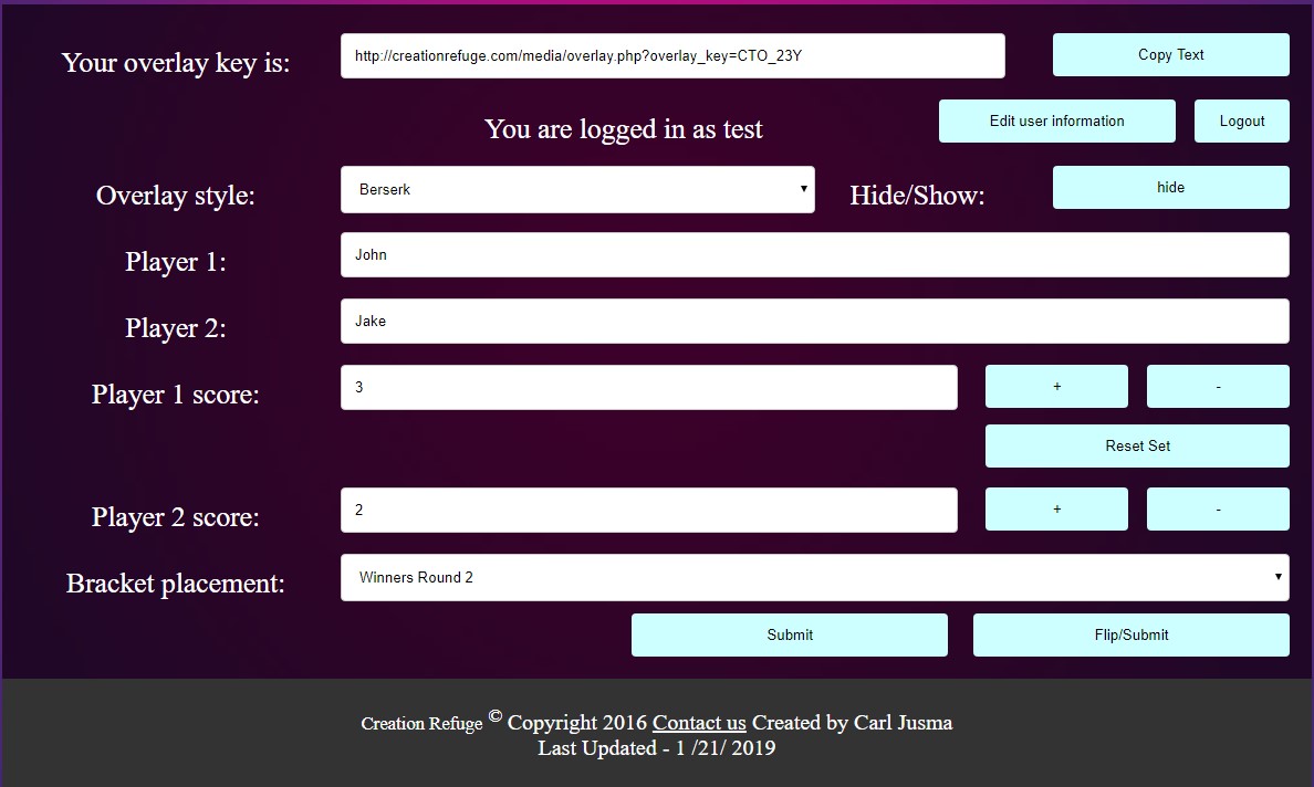 This is a web based score overlay designed for online fighting use, that can be used with streaming applications like OBS. Allowing an individual or a team to manage player names, score, and bracket placement in a quick and simple interface with messing with OBS direclty.